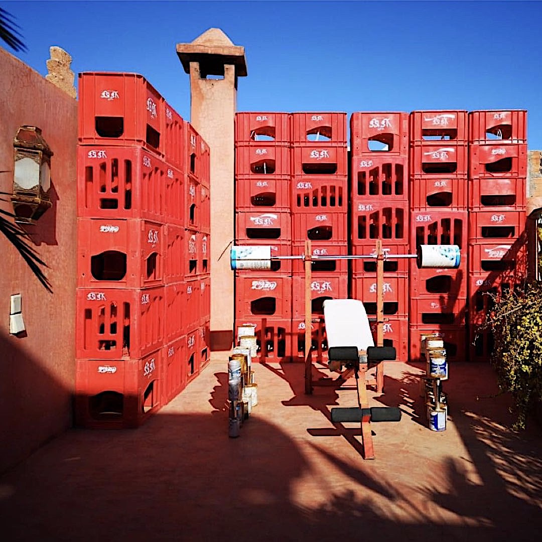Faire du sport avec la salle de sport รฉco-responsable sur le rooftop du Riad Yima, lโancienne art-gallery de lโartiste marocain ยซย iconiqueย ยป et polymorphe Hassan Hajjaj surnommรฉ ย ยปย l’Andy Warhol de Marrakech, le roi du pop-art marocainย ยป.